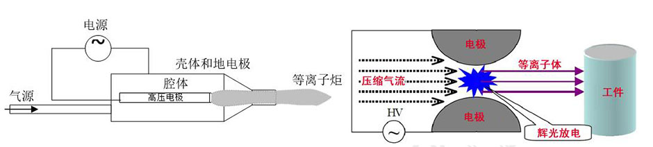 壓縮氣體通入等離子噴槍內(nèi)部氣流通道,在電極兩端施加交流高頻高壓,使兩電極間的壓縮氣體電離產(chǎn)生氣體弧光放電而形成等離子區(qū)。等離子在氣流的吹動(dòng)下到達(dá)被處理物體的表面而實(shí)現(xiàn)對(duì)3D表面進(jìn)行改性的目的。(PG-1000設(shè)備)